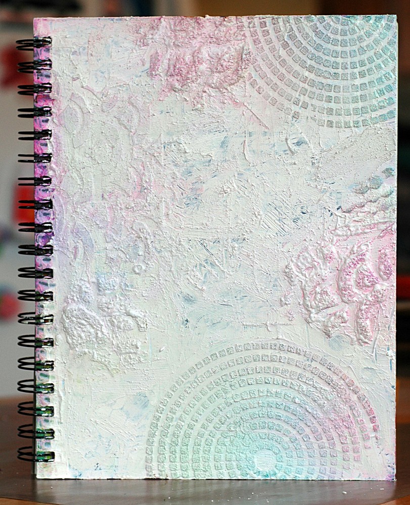 Well I coloured it… and really didn’t like it (note to self: Coarse Moulding Paste looks cools before colour but not so cool after misting) so I gessoed over the whole thing again: