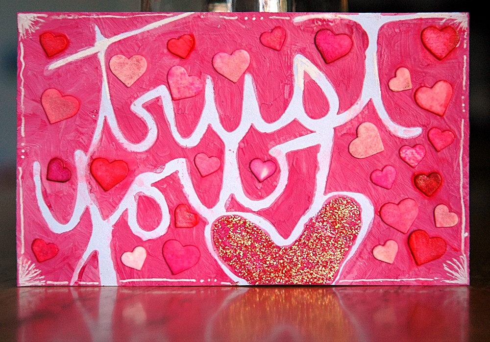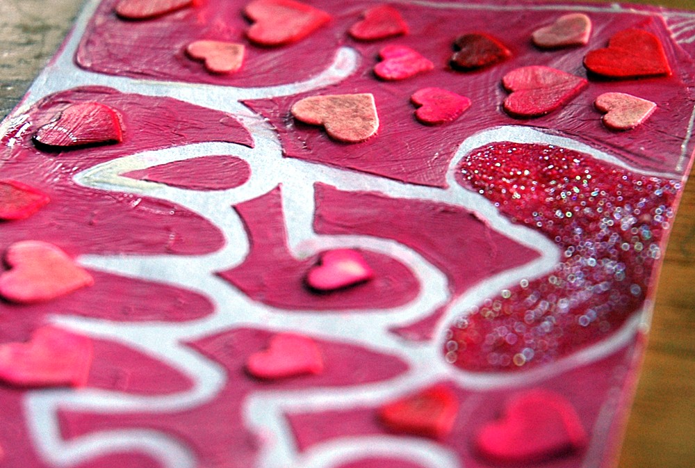 For this one, I mixed some red paint with my gesso and spread it over a stencil. Once it dried, I doodled the corners and edges with my white gel pen and filled in the heart with Fruit Punch Stickles.