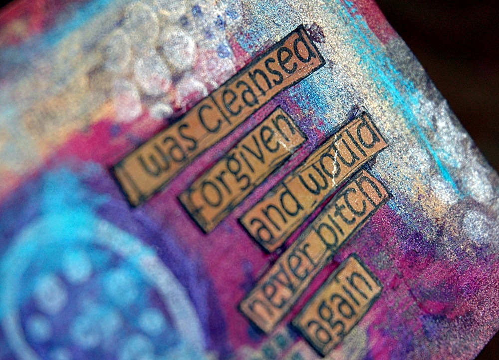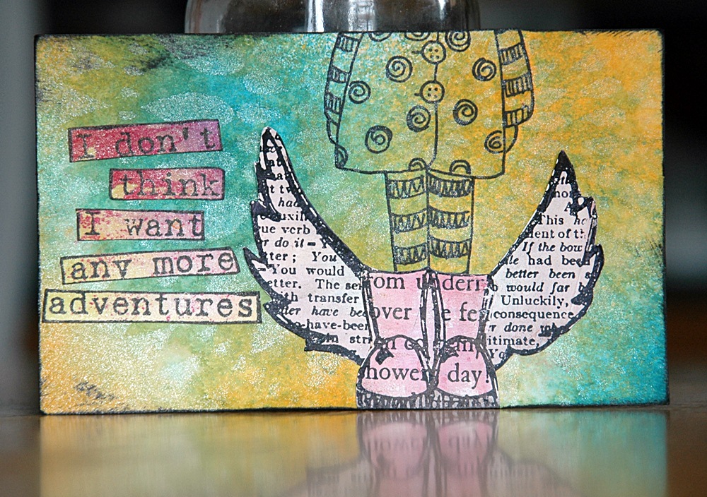 First I stamped the body image and masked it. Then I misted with water, then Dylusions, then water again to blend. I went a little overboard with the liquid and had a far amount of seepage under the mask, though that didn’t bother me – I kind of liked it anyway!