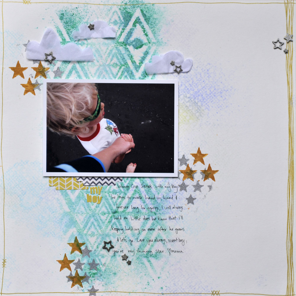 The Story Starter I used this month is one of my all time faves – and I’ll be doing another LO for Molly with it as well. Because I was waiting on product (I wanted to use the Bella Blvd. Molly line for Molly), I made Gabe’s LO first: