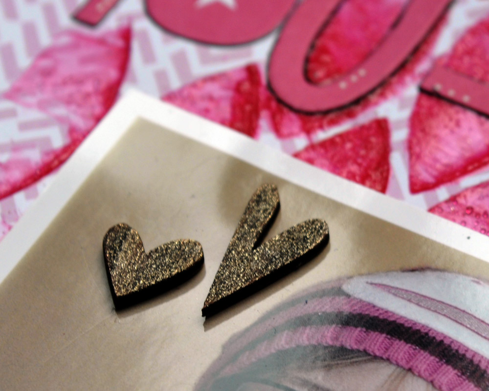 I don’t often get a chance to scrap them and I this template seemed to work with some recent pictures of them. The title is die cut and because the letter are small, I couldn’t use heavy chipboard. To get around that and get the thick look I wanted, I simply cut each letter from white cardstock three times and layered them on each other. I finished them off with Gold mist and a white Sharpie Paint Pen:
