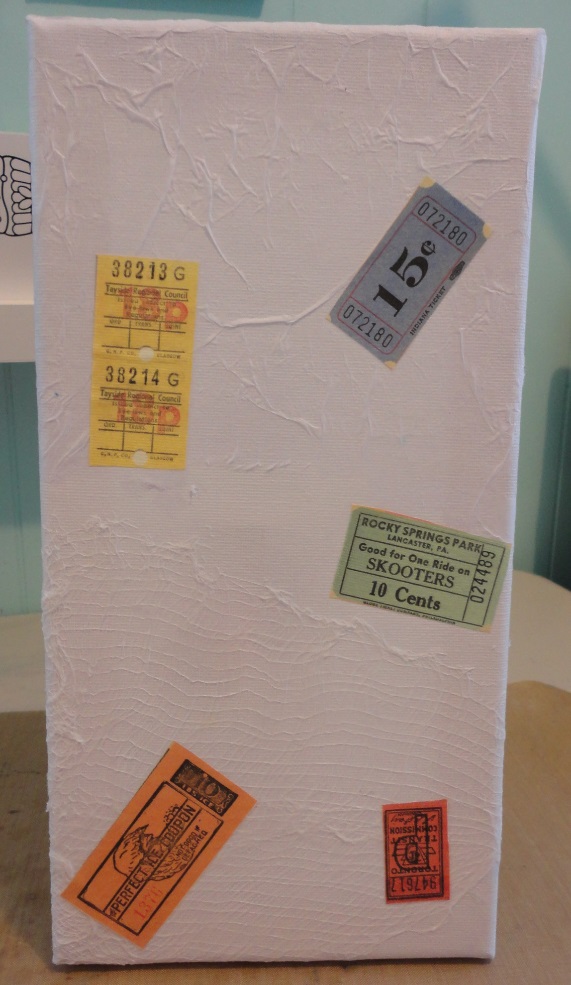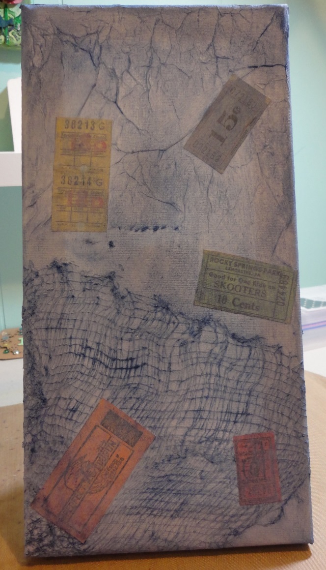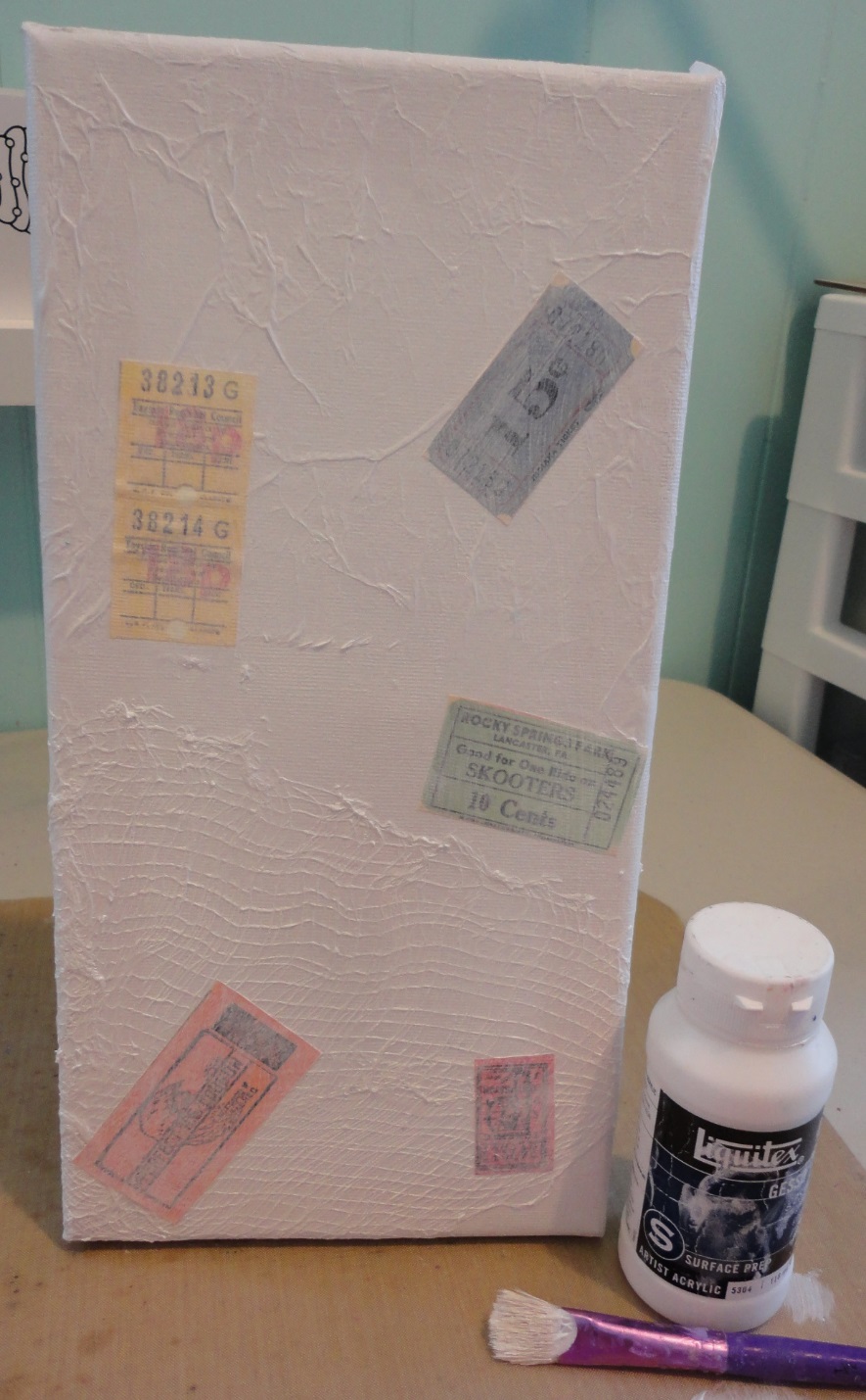 2. Glue. Practicality dictates a glue-stick, but my personal low-cost preference is for Elmer’s School Glue Gel. It’s blue, but dries clear. It can stick things, but also functions as a resist and a crackling medium in a pinch. If money is less of an object, go straight to the good stuff and buy yourself some Jones Tones Plexi Glue. That is the bee’s knees of PVA and can be used to create an embossed effect, with a little acrylic paint (as you can see in a post here)