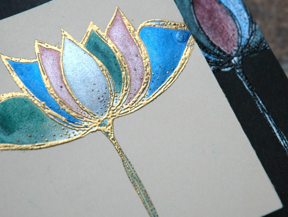 To make both LO’s, I picked three different colours of Distress Ink and blended them to get an ombre look, starting with the lightest and working my way up. I used the small round ink blending tool from Ranger, I like it better than the large one, and went over the colours a lot to get a seamless and smooth colour blend. I find that if you start light and keep adding colour, you are less likely to get lines from both the tool and between colours. If you look carefully, it seems that I have more than three colours on the page but that’s because of the overlap while blending.