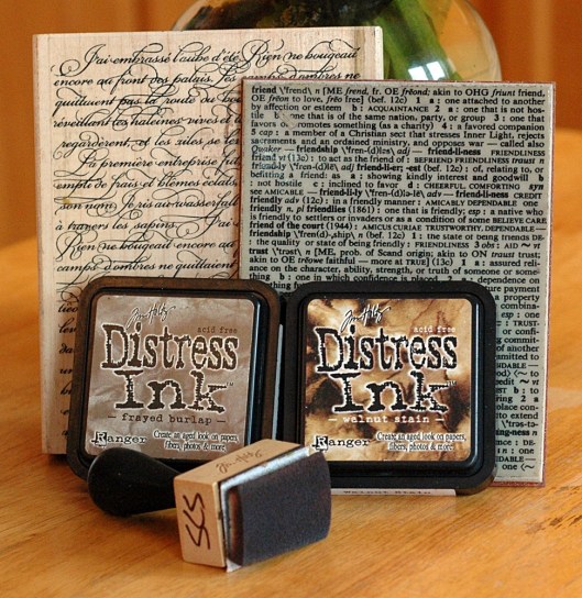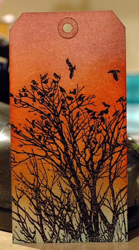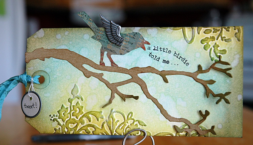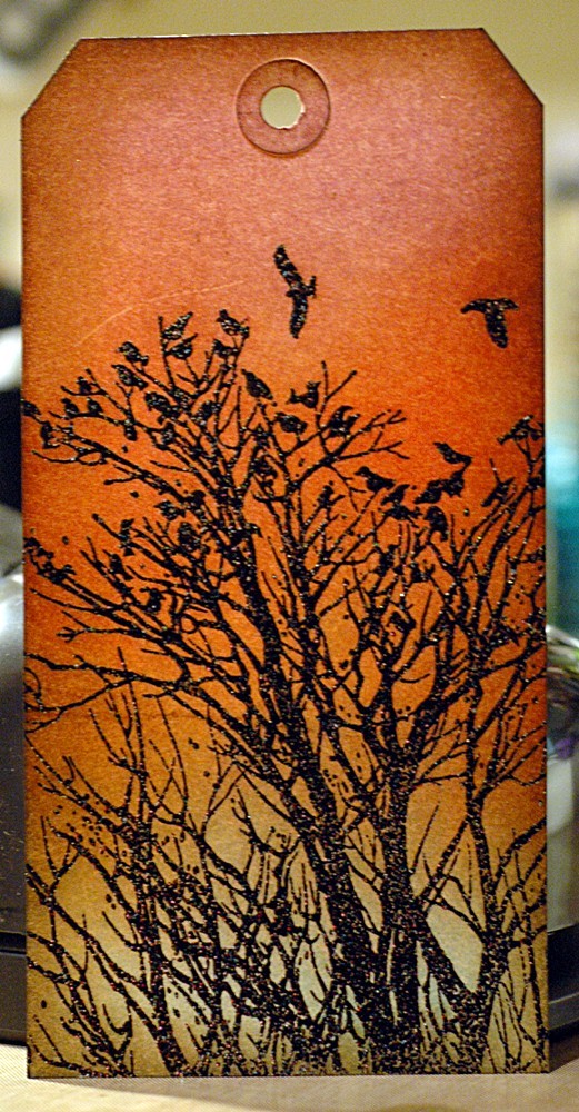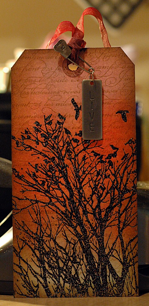 My finished tag started with a background layer of Distress Ink, then the palette knife technique (my fave!) and the cosmetic sponge (fairly wet) technique. Some stamps, Perfect Pearls Mist, and tissue tape finished it off!