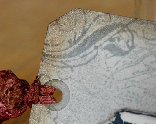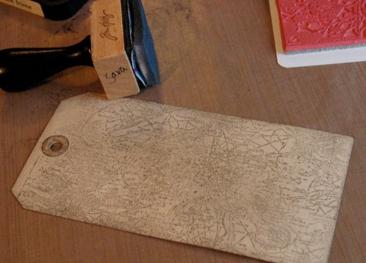 Set this aside to dry – we’ll be doing some heat embossing later and we don’t want the powder to stick to the entire tag.