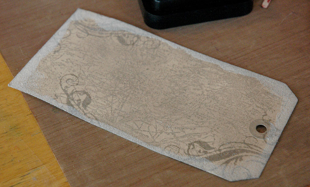 Now flick the tag to knock off a lot of the powder and then heat set the rest. Use an ink blending tool with Gathered Twigs to ink over the embossed areas, then repeat the powder step again. Next, ink with a darker brown, like Walnut Stain. You should see light areas under the powder and dark areas in between where parts of the powder were licked off then inked over. It’s a neat, aged look and effect.