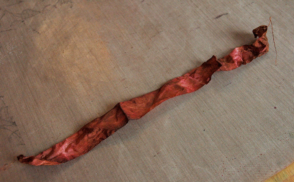 You’re going to need ribbon to finish off the tag so run the Aged Mahogany ink pad over some Crinkle Ribbon, then spritz with water to blend. Crumple into a ball and dab with Gathered Twigs. Let dry or heat set – the two colours should give an aged and faded look to the ribbon.