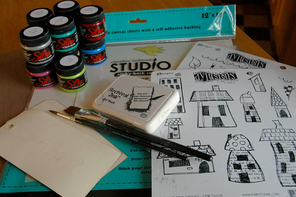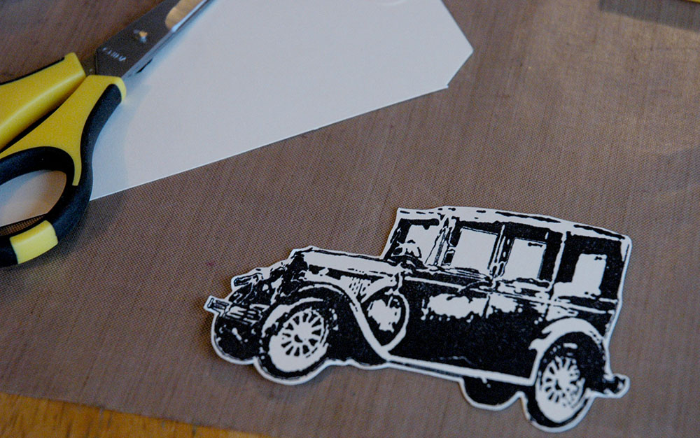Ink up the car stamp with black Archival and stamp onto a spare manilla tag, then cut it out.