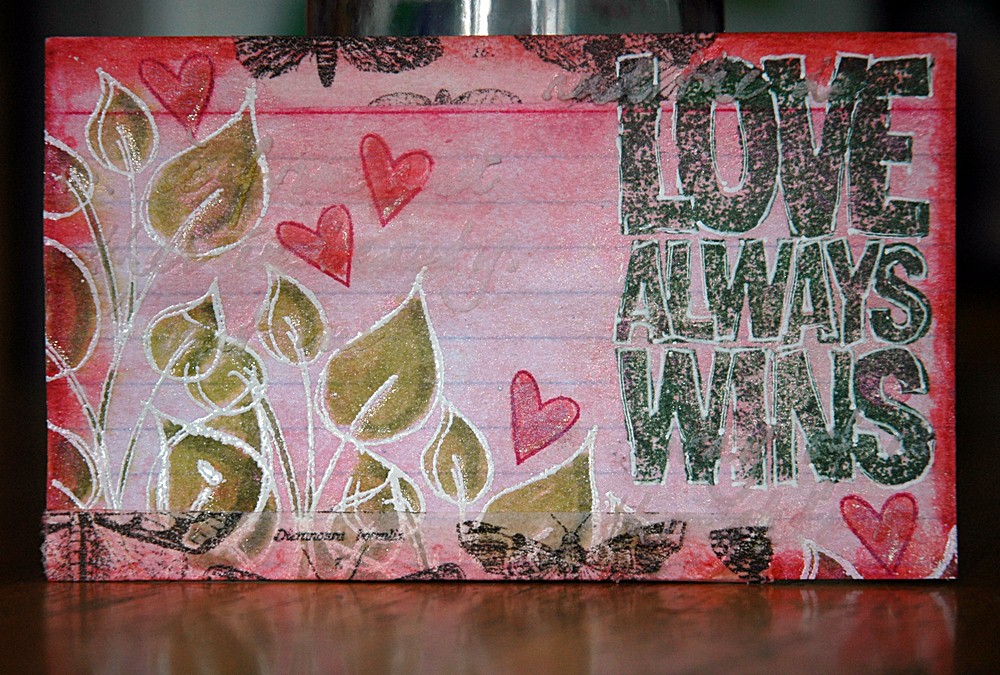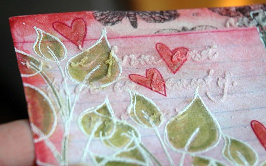 I really liked the look of the vibrant colours and didn’t want to mess with it too much so I simply smeared some white gesso over a patch, stamped my sentiment, and added some extra texture and dimension with a stencil and Coarse Pumice Gel.