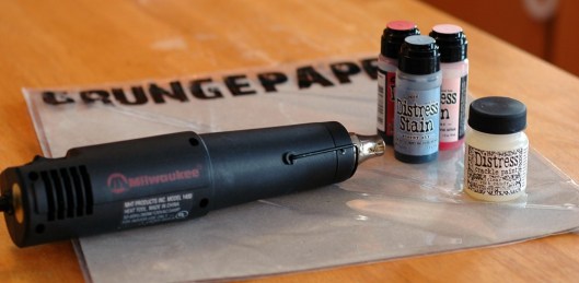 For this technique, you do need a very specific product, Distress Crackle Paint in Clear Rock Candy. You’re also going to need a non-stick craft sheet (to contain the mess), Distress Stains, and Grungeboard or Grungepaper.