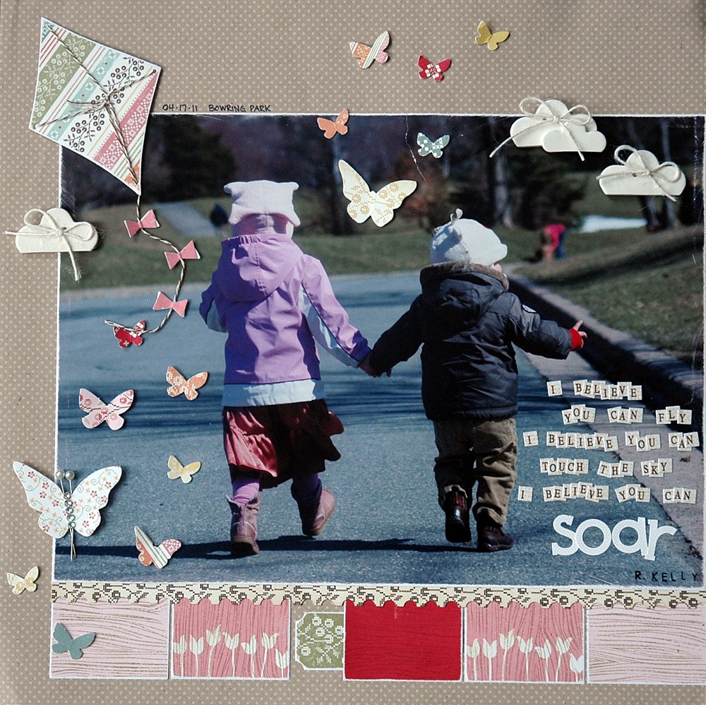 Here’s another LO I did using Basic Grey, and my all time favourite collection, Basics. I also used Doodlebug Jack & Jill alphas in Swimming Pool (no one does alphas like Doodlebug!), October Afternoon Thrift Shop and Fly a Kite, a Martha Stewart Doily, and a bunch of border punches.