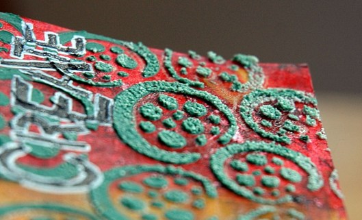 Essentially, there’s a ton of paper towel on here, and a bit of book paper. Then some Coarse Texture Gel over a stencil and heated, which added to the hot mess, so Flexible Molding Paste and another stencil.
