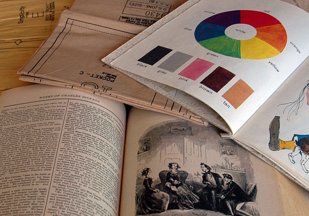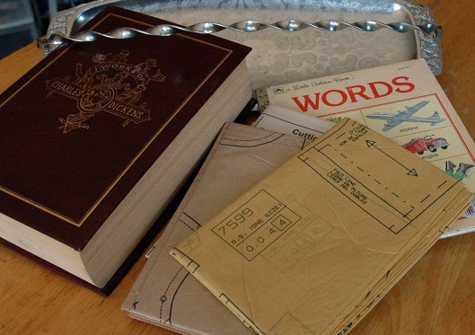 …an old book to cut up, a great kid’s book for colourful backgrounds, some sewing patterns, and a bonus silver serving dish.