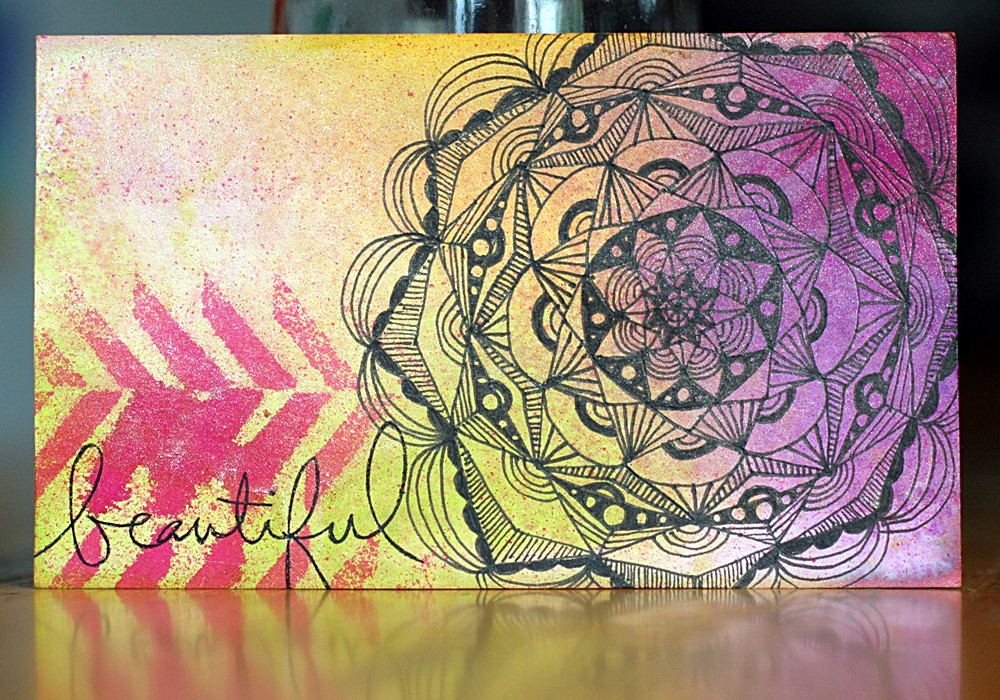 This one was just fun to do. I used my Twinkling H2O’s and randomly painted, adding extra colour here and there, then added in some stencils and punchinella.