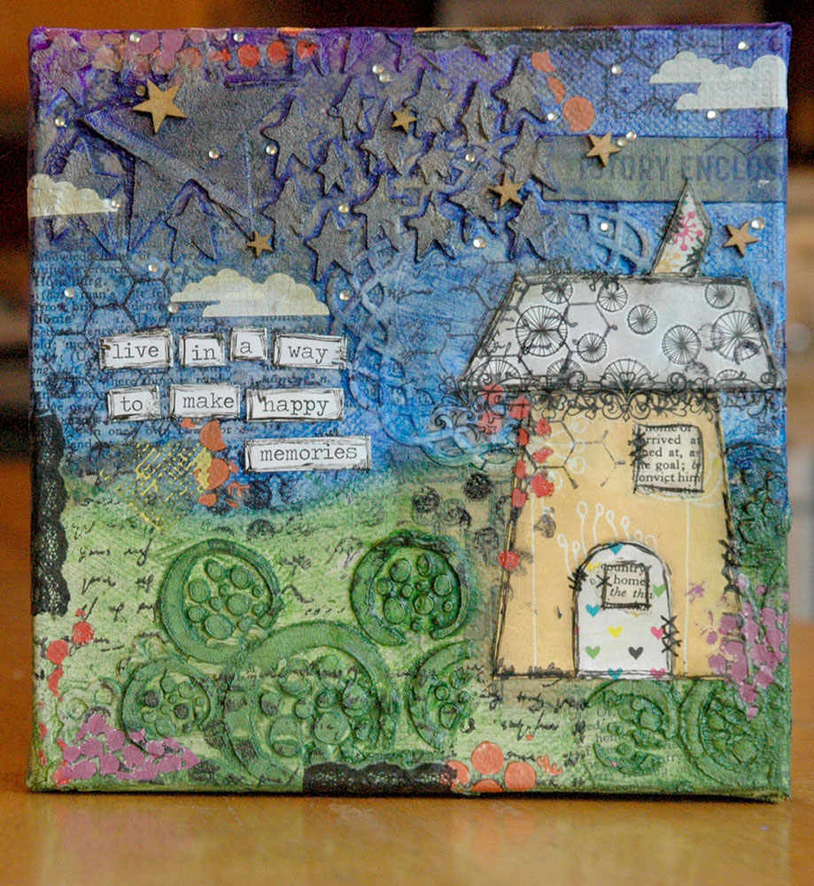 This looks all wet and messy because I have found that on canvas the paint covers better and easier if I wet the fabric first. You do want to be careful because if you use too much water (I have 4-5 layers of paint and water on the house) you will get this wicking of the paint happening. Not an issue for this tag, I have plans to disguise it and the style of the stamp lends itself to an imperfect effect anyway.