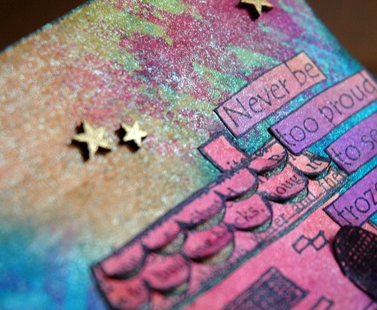 My favourite effect though, happened when I embossed the stamp on glassine, then crumpled it all up and painted on the broken surface – the darker paint colours stayed vibrant with a ton of shimmer!