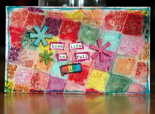 And see the flecks of white on both glassine surfaces (you can see it best on the first card)? That’s the embossing powder. When I crumpled the paper it broke the hardened powder and when I painted, the brush and water caused flecks to flake off and stick in the paint colour. I think it looks cool – love that side effect!